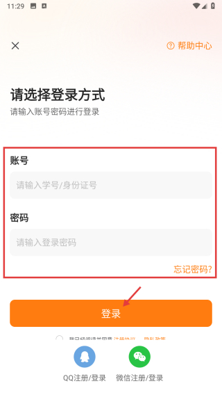 4、在登录方式选择页面,输入学号/身份证号和密码,点击登录按钮,完成账号登录操作。