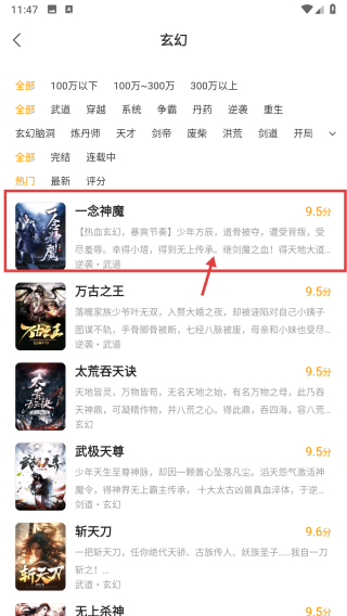 3、在玄幻小说列表里,选择一念神魔条目,进入小说详情页。