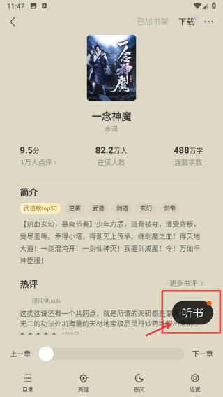 4、在小说详情页,点击听书按钮,开始收听该小说的音频内容。