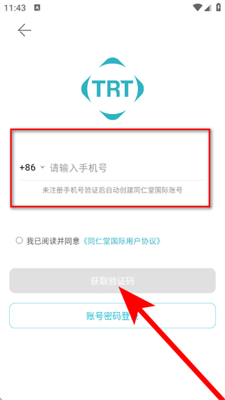 3、在登录页面,输入手机号,勾选后,点击获取验证码。