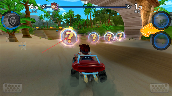 1、在赛车场赛道上会出现带有问号标志的气泡,获取后会随机获得道具。