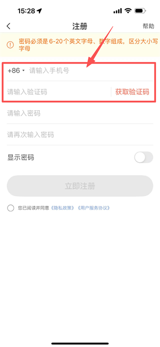 3、在注册页面,输入手机号,点击获取验证码并输入。
