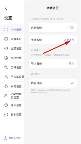 2、在设置的本地备份板块中,点击马上备份,启动本地备份流程。