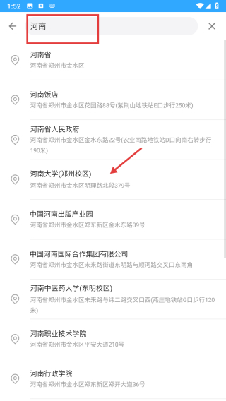 3、在地址搜索结果页,选择郑州市金水区相关地址如河南大学郑州校区,进入天气详情页面。