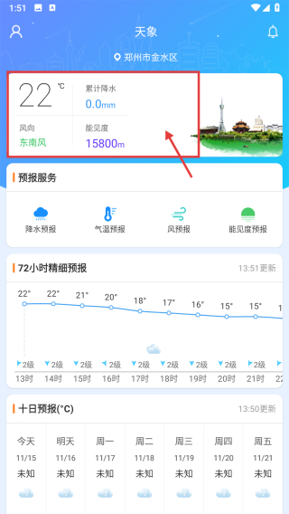 4、在天气详情页面,查看郑州市金水区的天气信息如温度22℃、风向东南风等。