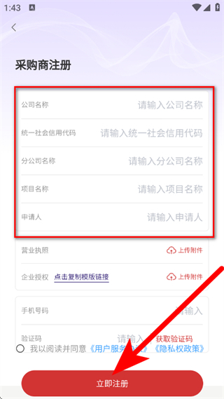 4、填写公司名称等信息,输入手机号和验证码,勾选同意后,点击立即注册,完成注册。
