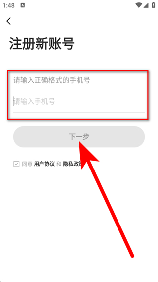 4、在注册页面,输入手机号,勾选同意后,点击下一步。