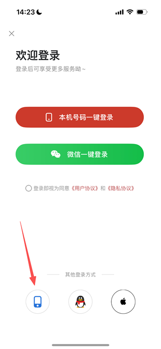 3、在登录页面,选择手机号登录方式,进入手机号登录页面。