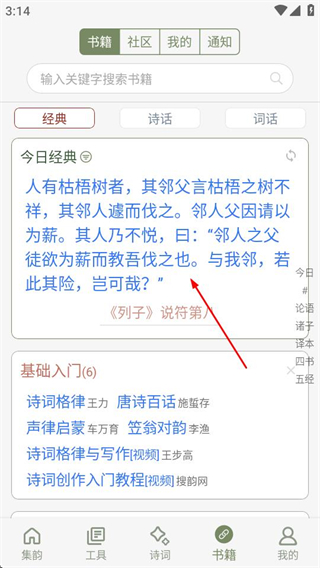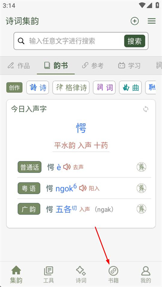 1、在诗词集韵首页,点击底部书籍选项,进入书籍页面。