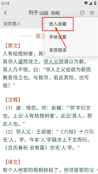 4、在操作选项中,点击放入收藏选项,可将该书籍内容收藏。