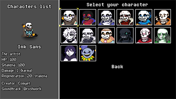 十四位角色各有专属技能与职业特性,如Ink Sans免疫特定攻击、Error Sans有概率规避伤害,可根据战斗需求灵活选择,适配风格。