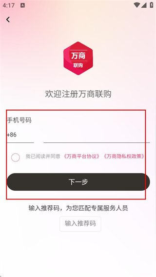 4、在注册页面,输入手机号码,勾选协议后点击下一步。