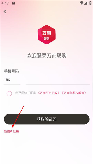 3、在登录页面,点击新用户注册选项,进入注册页面。