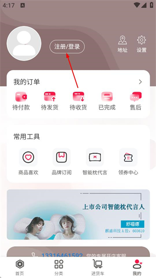 2、在个人页面,点击注册登录选项,进入登录页面。