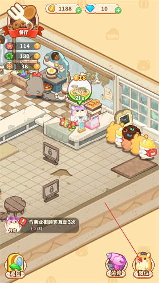 1、打开游戏进入餐厅店铺内部,点击右下角的岗位进行员工调整。