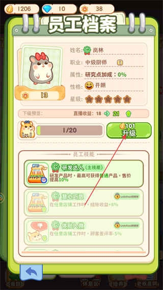 4、在员工档案中可以看到抽中的员工信息,点击升级可以花费瓜子币进行等级提升。