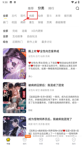 2、在分类页面,点击纯爱分类,进入纯爱小说列表页。