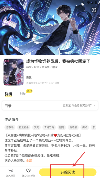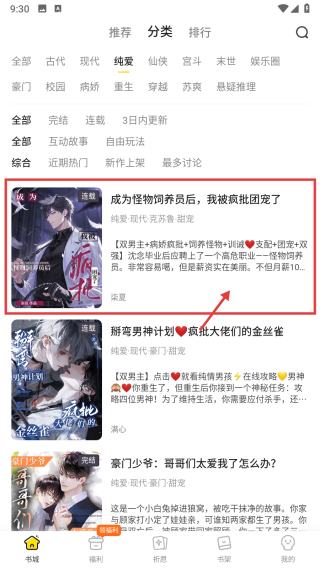 3、在纯爱小说列表里,选择成为怪物饲养员后,我被疯批团宠了条目,进入小说详情页。