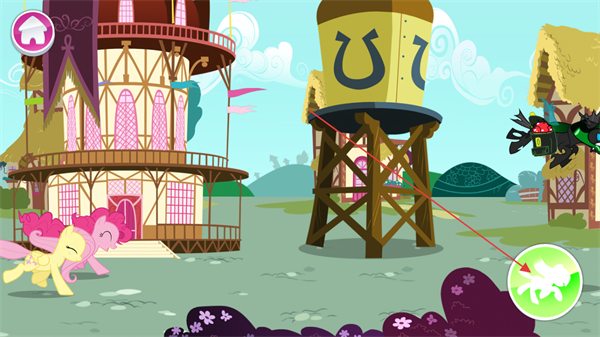 1、操控小马在小镇中奔跑,躲避黑色反派的追击,利用地形周旋。