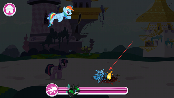 2、让彩虹小马携带水球,投向火焰,熄灭火焰推进任务。