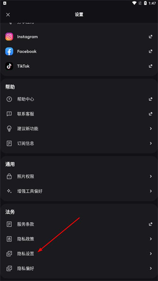 2、在设置页面,点击隐私设置,进入隐私设置页面。
