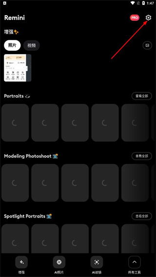 1、在remini首页,点击右上角设置,进入设置页面。