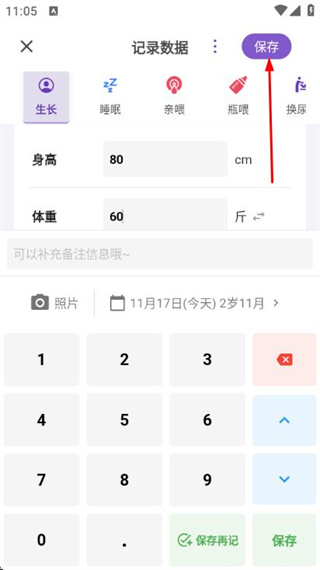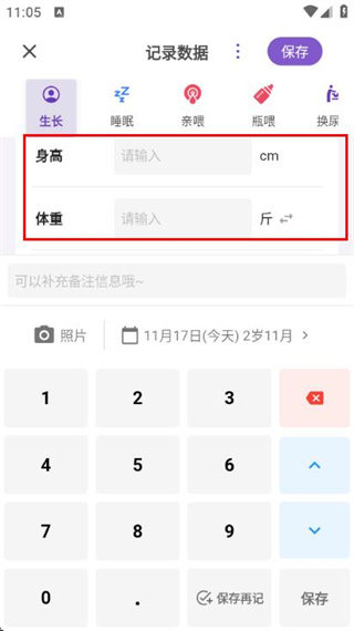 2、进入记录数据页面后,输入孩子的身高、体重等信息。