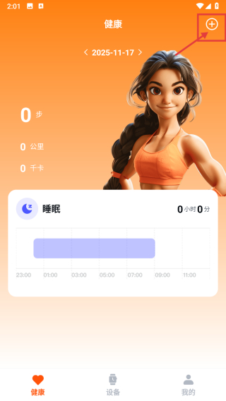 2、在健康页面,点击右上角加号图标,展开功能选项。
