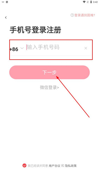 3、在手机号登录注册页面,输入手机号码,点击下一步。