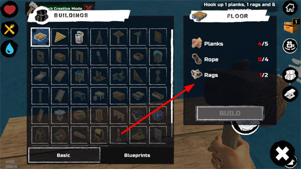 3、建造界面可选择建造的建筑,如地板、工具台等,消耗对应的木板、绳子、破布等资源进行建造,需根据需求优先建造关键建筑。
