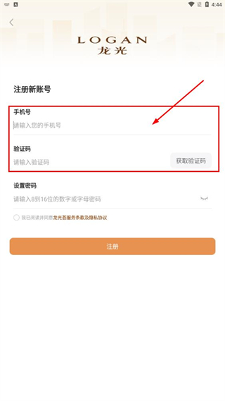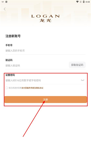 5、勾选已阅读并同意龙光服务条款及隐私协议后,点击注册,完成账号注册操作。