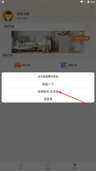 3、在提示框中,点击没有账号,去注册,进入注册账号页面。