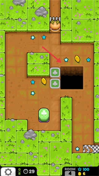 2、跟随红色路径指引,收集星星和金币,沿着路线向终点移动。