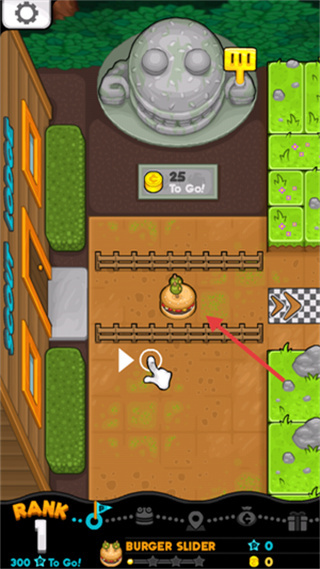 1、操控汉堡滑块,沿红色箭头方向移动,朝着黑白格子终点前进,开始收集资源。