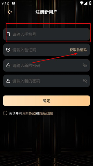 2、在注册新用户页面输入手机号,点击获取验证码。