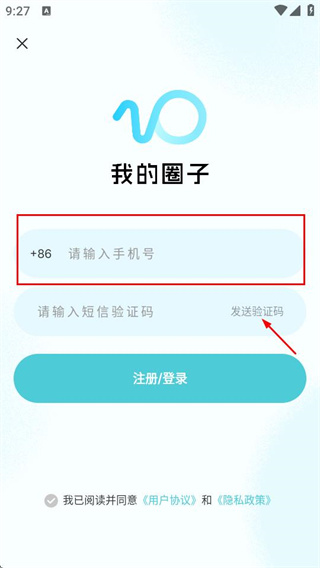 2、在我的圈子页面输入手机号,点击发送验证码。