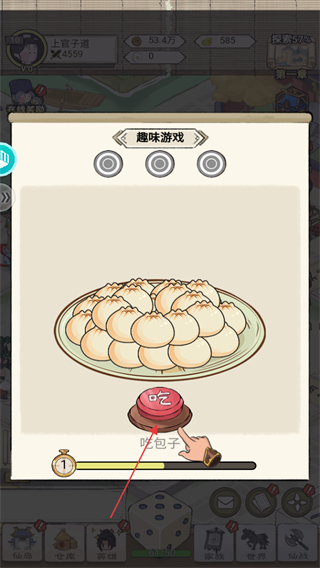 3、趣味游戏随机出现,如吃包子游戏通过点击下方红色按钮在倒计时结束前吃完所有包子。