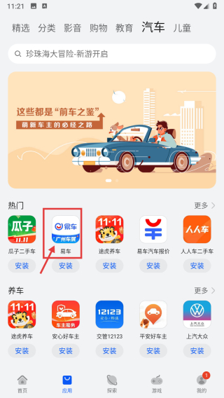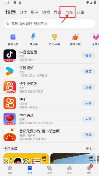 2、在应用页面,点击汽车标签,进入汽车类应用列表页。
