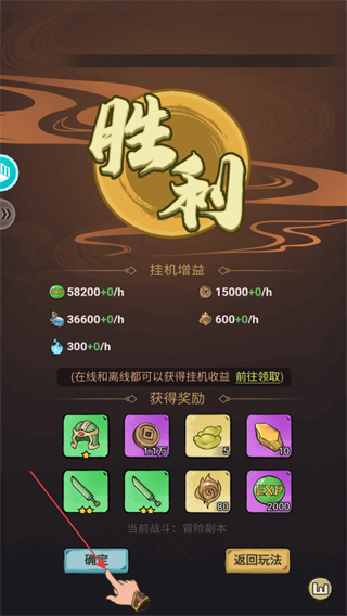 3、冒险关卡副本胜利后会获得丰厚奖励,如装备武器和金币等各种资源。