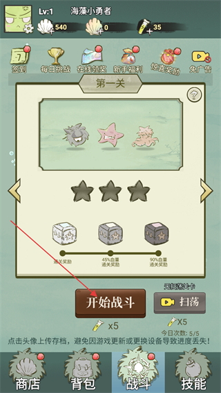 1、打开游戏进入菜单界面,查看关卡通关条件点击开始战斗进入关卡。