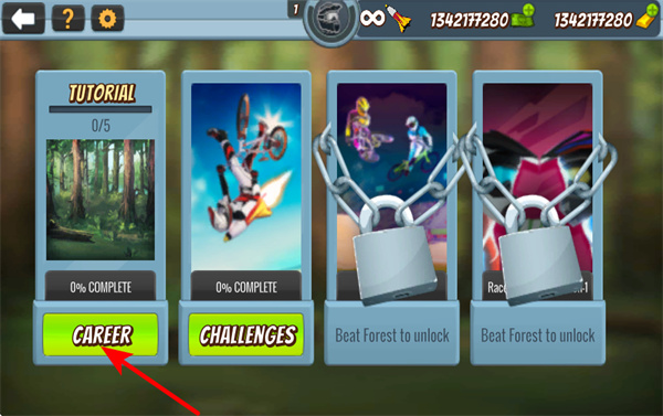 1、游戏中点击CAREER按钮,职业模式开启骑行挑战,这是推进游戏进程的关键操作,选择关注模式关卡难度奖励。