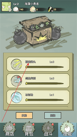 1、在游戏主页点击技能,可以查看现有技能等级和具体描述。