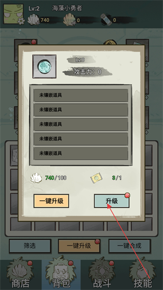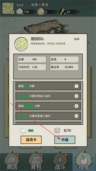 4、点击上方的道具栏可以使用道具券和贝壳币进行升级提高战力。
