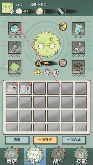 3、打开背包页面,查看小勇者的战力指数与背包内的物资。
