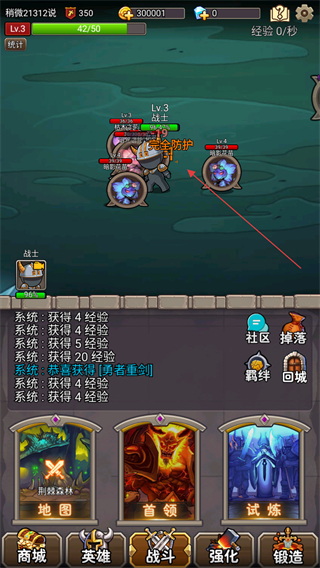4、持续挂机战斗,获取海量金币和经验,还能获得装备如勇者重剑,不断强化英雄战力。