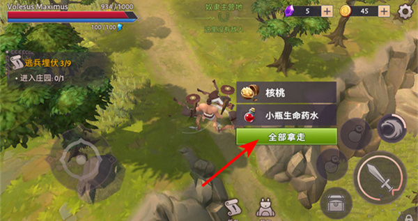 2、击败敌人或探索资源点后,点击全部拿走按钮,可获取道具和金币,这是重要操作,及时执行避免遗漏。