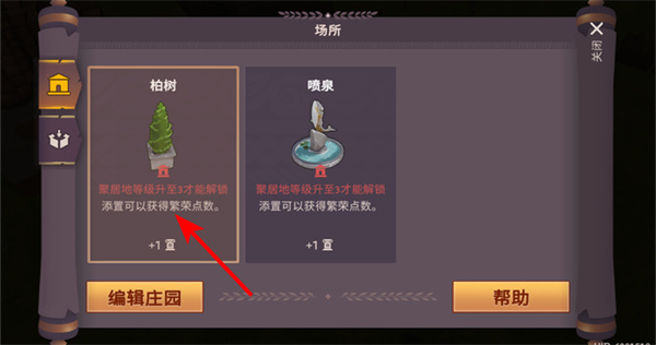 3、在场所界面中,解锁并放置柏树等装饰,可获得繁荣点数,这是提升庄园等级的重要途径,解锁时需满足地域等级等条件。