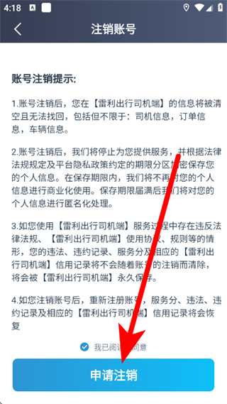 5、在注销账号页面,勾选我已阅读同意后,点击申请注销。