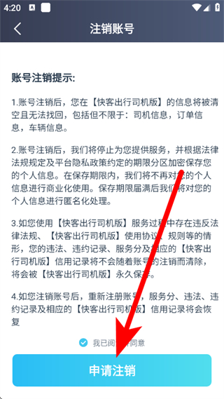 5、在注销账号页面,勾选我已阅读同意后,点击申请注销。