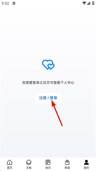 2、在个人中心页面,点击注册登录按钮,进入登录页面。
